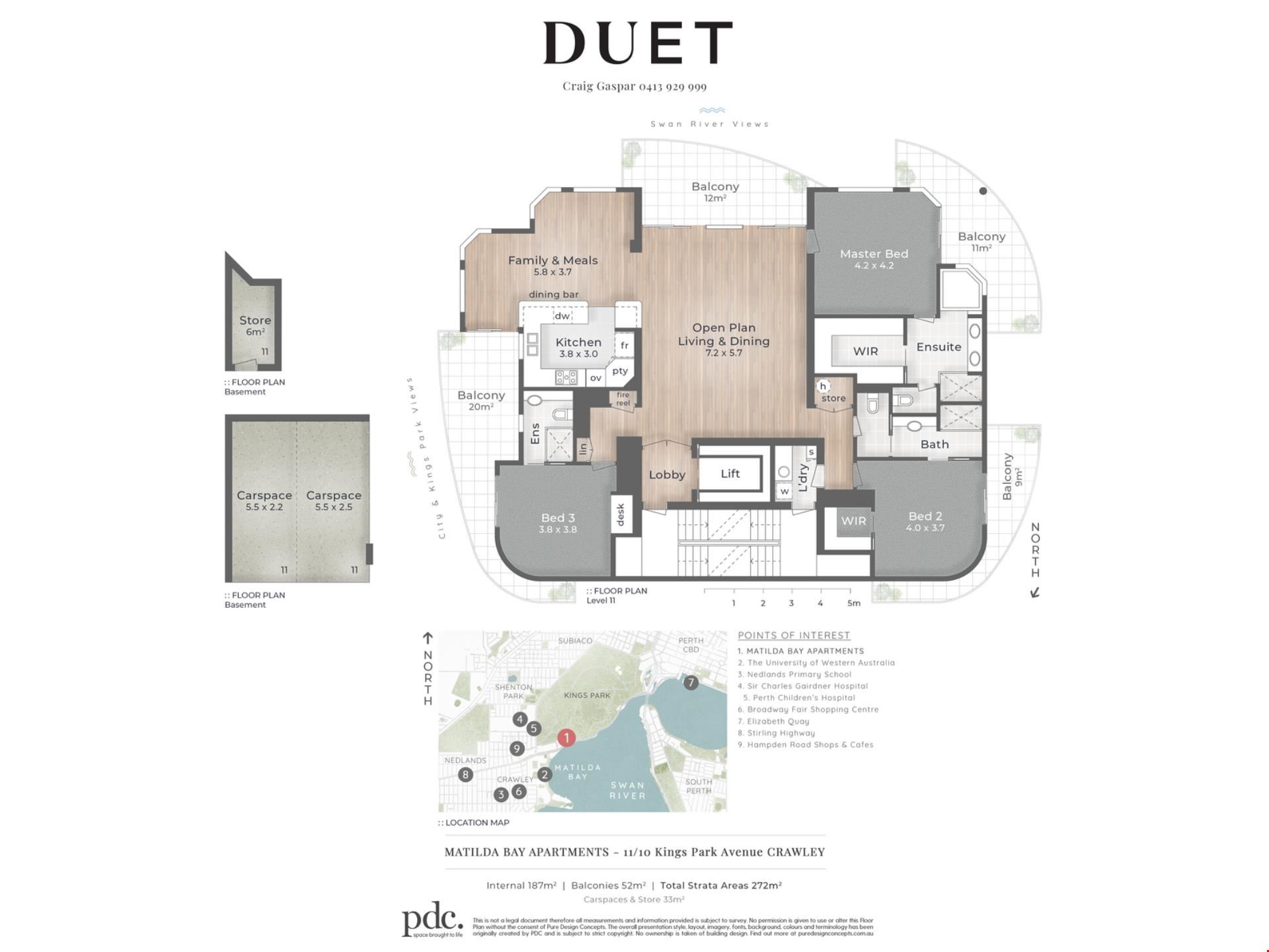 Build Area: 272m2 total (187m2 apartment, 52m2 balconies, 27m2 carbays & 6m2 store)